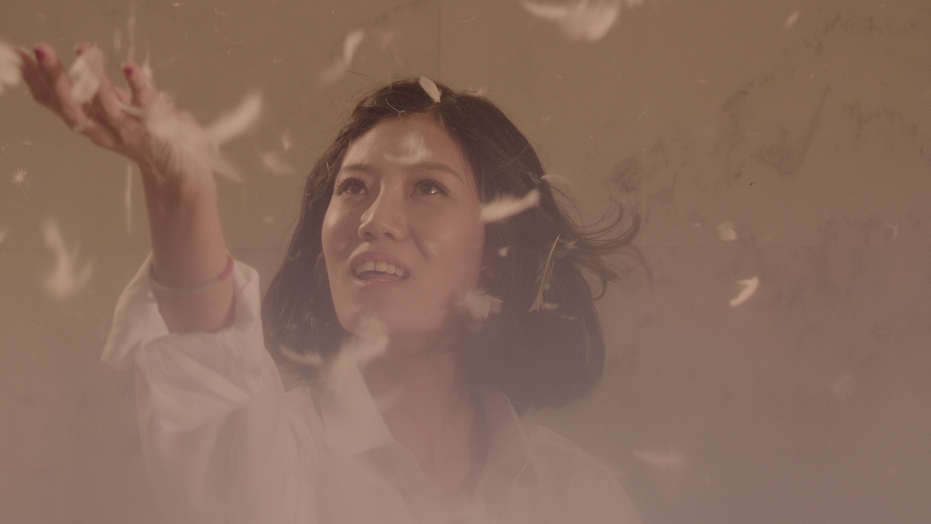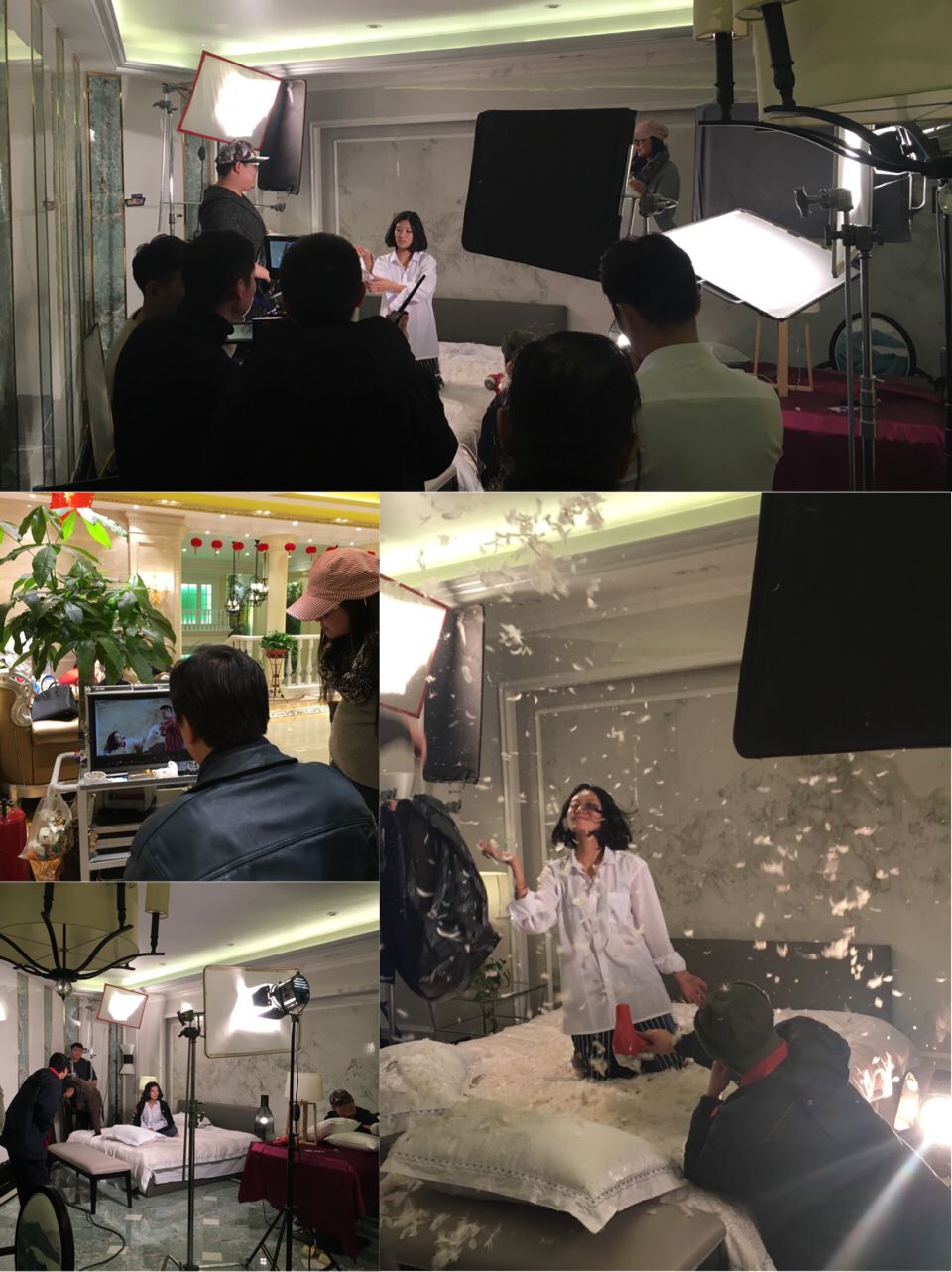 為達到畫面唯美浪漫的效果,現(xiàn)場工作人員全力配合攝像,吹風機吹羽毛,編導手撒羽毛,女主角在飄落的羽毛中盡情表演……
