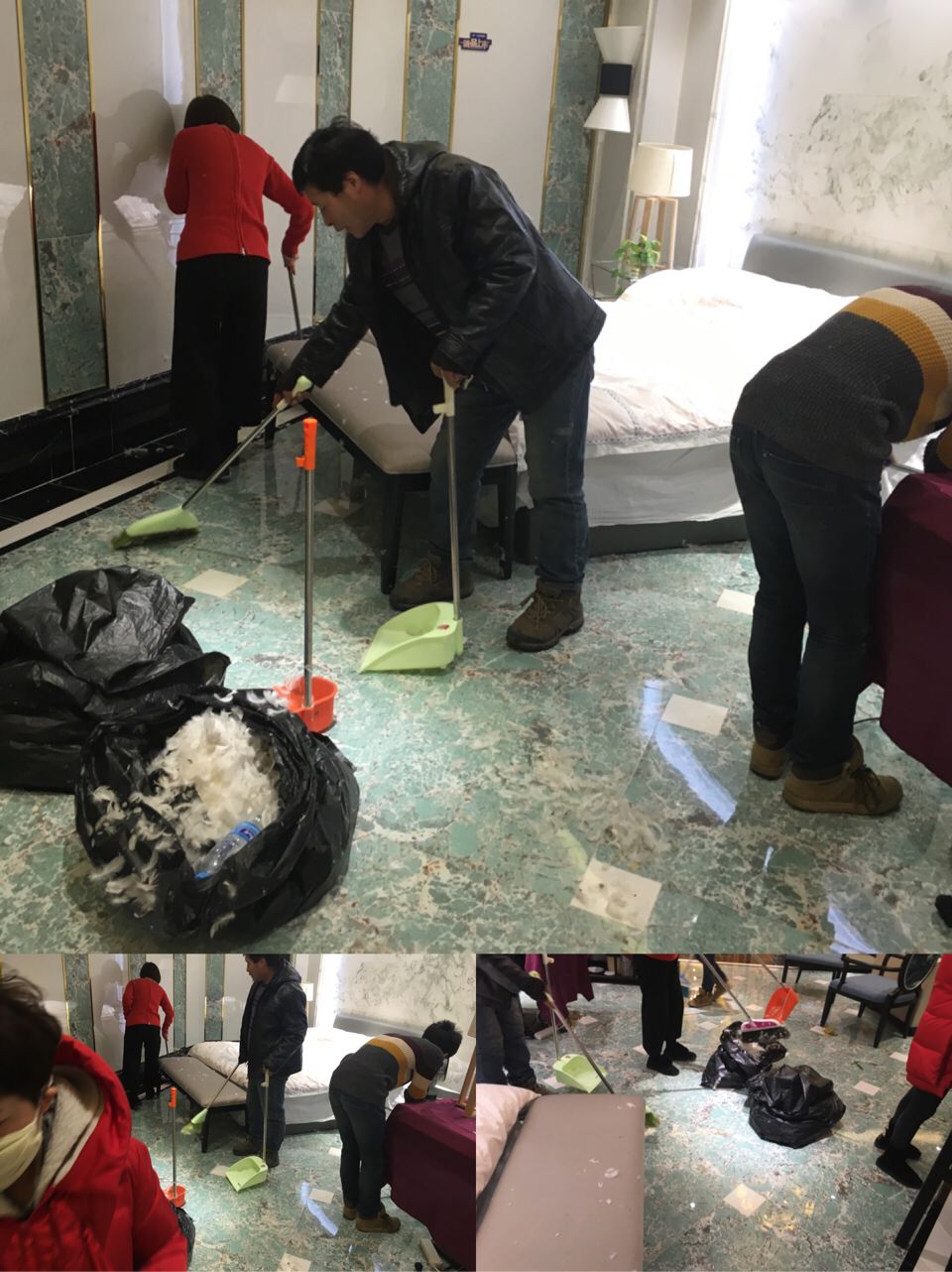 每一部作品的背后都凝聚著眾多人默默的付出和努力,《枕頭大戰(zhàn)》拍攝完成后,場務(wù)和工作人員及時打掃“戰(zhàn)場”,清理散落的“一地雞毛”。