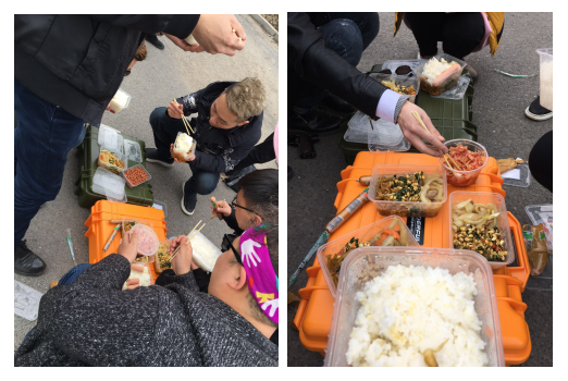 接下來的攝制組于演員們的午餐時間,小伙伴們支起簡易餐桌,席地而坐,開吃。