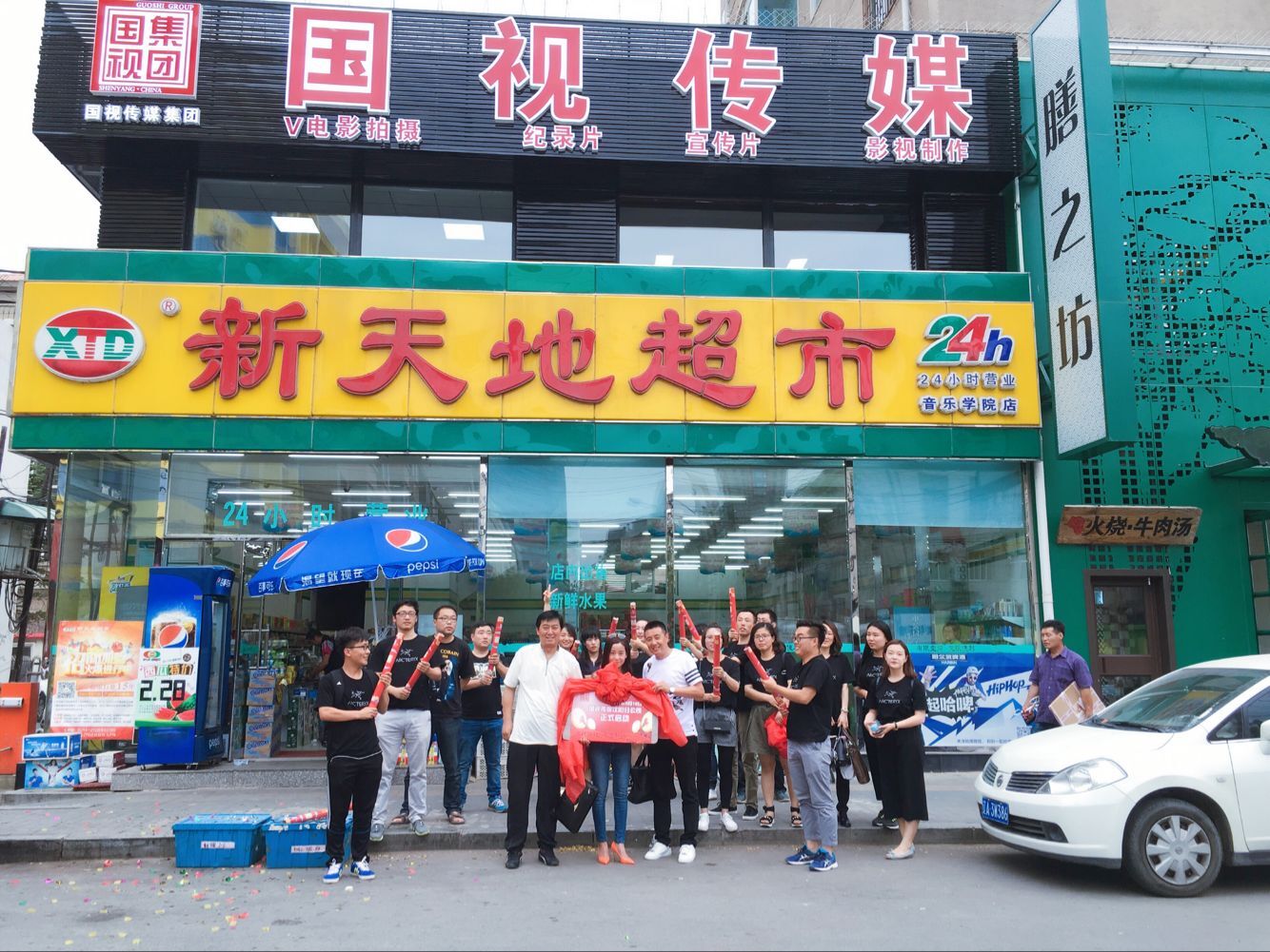 新影團(tuán)隊(duì)全體成員共同慶祝分公司開業(yè),圖為揭牌儀式。
