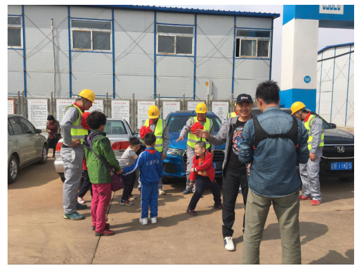 看到孩子們一張張?zhí)煺婵蓯鄣男δ?,現(xiàn)場的建筑工人仿佛見到家人般地笑逐顏開。