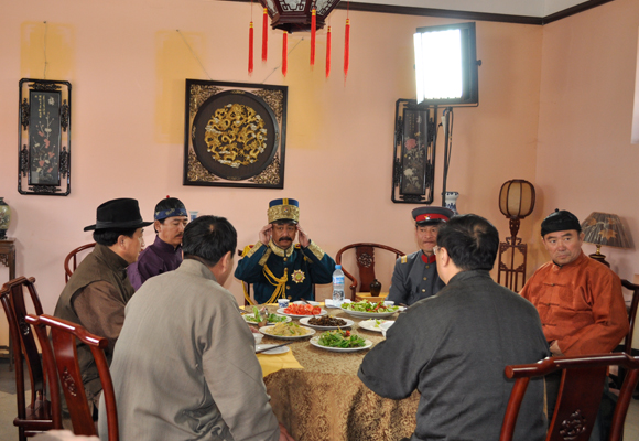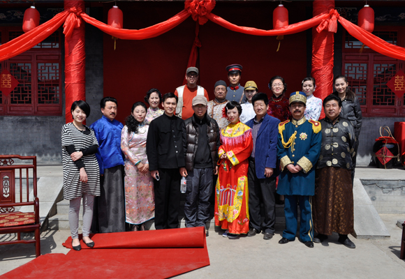 這里是我們的演員陣容,中間最扎眼的大紅色,她是我們的新娘子于鳳至,中山裝就是她的丈夫張學(xué)良先生了,穿軍裝的那一位是新娘子的老公公大帥張作霖,其他人員都是這三位的粉絲。看看采取下蹲姿勢照相的兩位,左邊是我們的導(dǎo)演,右邊是我們的攝影師,后面跟著一群護法。