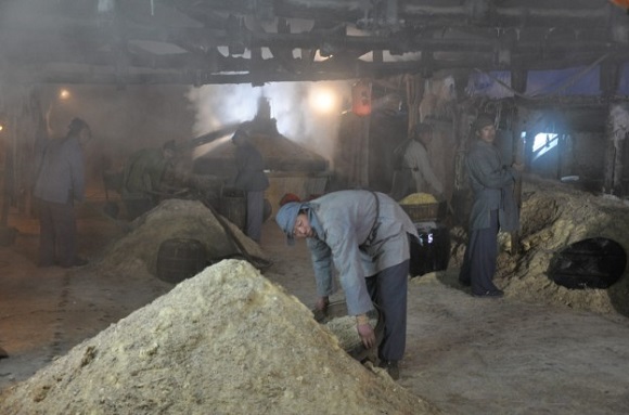 大東北天寒地凍,酒坊里的大冰溜子凍得老厚了。你瞅瞅,那棚子頂上,鋒利的冰溜子都能當武器用了。我們的工作人員完全失去了動(凍)手動(凍)腳的激情,一點都不愿碰那些鐵機器,只想把手藏在衣服兜里。